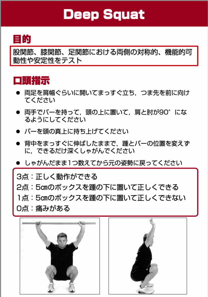 *ディープスクワット・テストの目的や評価については下記PDFまたはFMSマニュアル