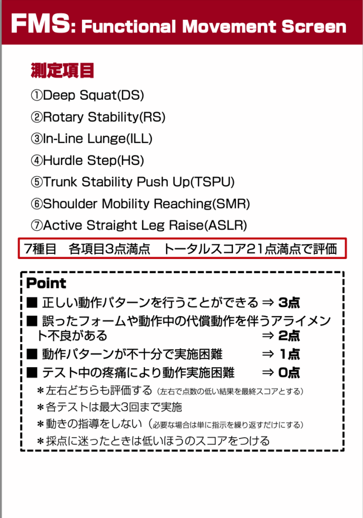動作をする中で、機能障害(痛み・外傷や障害)や関節の可動域、筋力や運動連鎖が正しく実施されているかを点数で評価できるテストです。点数のみならず、選手の身体操作を観察でき、なかなか面白いです。大学のメディカルチェックでは全種目行っており、そこでは関節可動域の測定など複数の測定種目を組み合わせています。単独で行うより、動作のエラーが起こる原因などがより特定できるかもしれません。