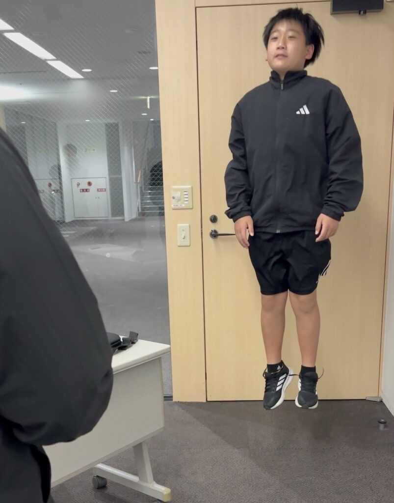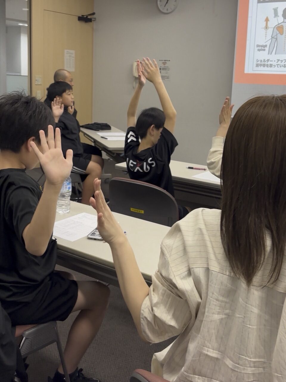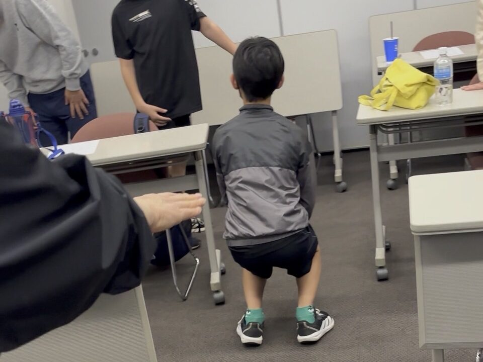 スクワットからカーフレイズの一連のジャンプの動きを動きをみせる→やってみるを繰り返しました